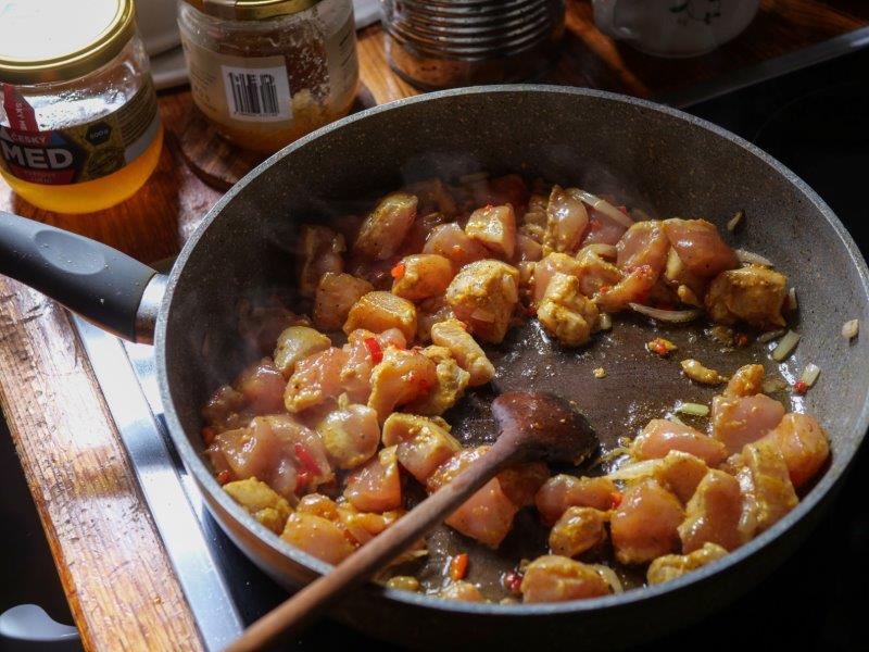 - Cut the chicken breasts into cubes and marinate them for a while in a salted mixture of olive oil, meadow honey, curry, and chili.