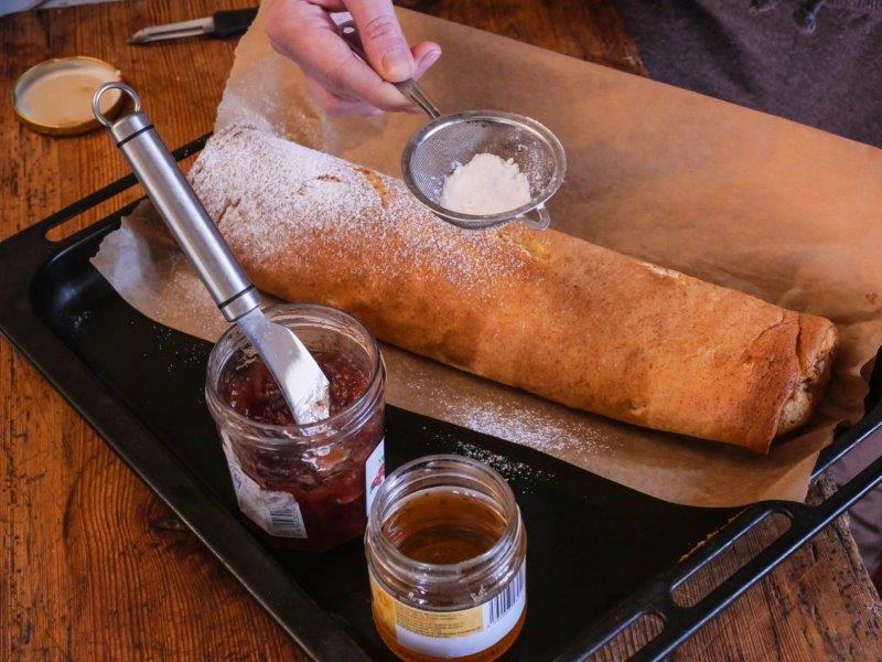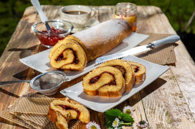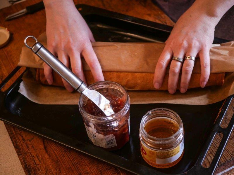 After baking, spread your favorite jam on the cake base or whip mascarpone with a few tablespoons of condensed milk. Using baking paper, roll up the spread cake base and let it cool.