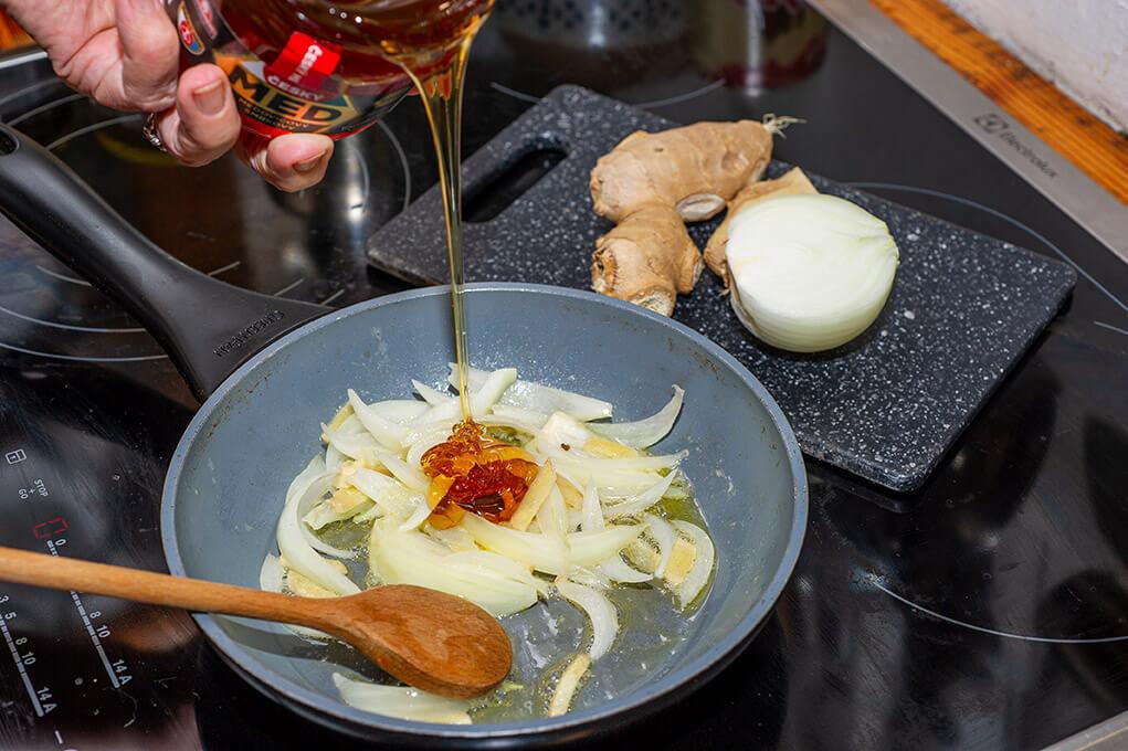 Melt most of the butter in the pan, sauté finely chopped ginger and sliced onions until fragrant, add most of the honey, heat through, pour in half of the wine and pour over the meat, add the remaining wine, cover with a lid, and slowly bake until tender (add liquid as needed).