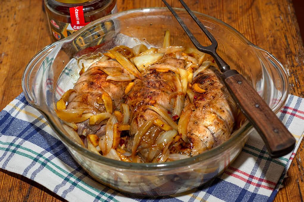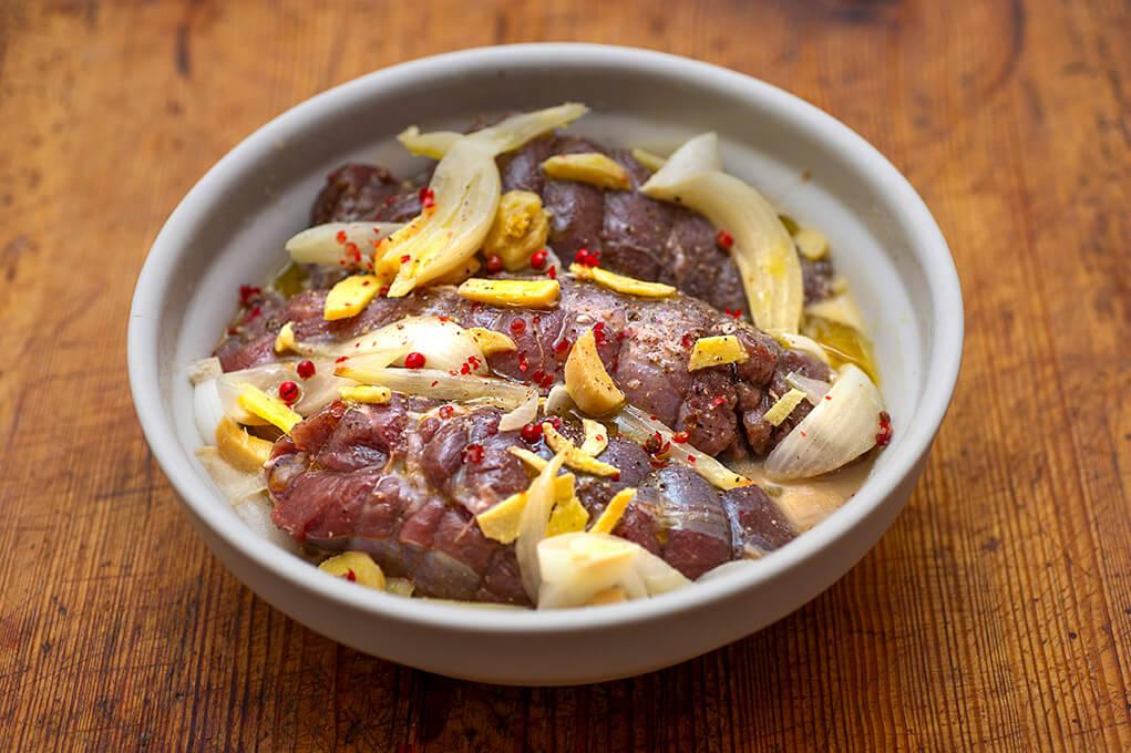 Remove the membrane from the haunch, wrap it with thread to maintain its cylindrical shape. Salt and pepper the meat, sear it on all sides in an oiled pan, and place it in a baking dish.